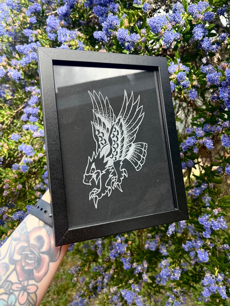 This isn’t just wall art… it’s a statement. Inspired by the bold lines and raw attitude of classic traditional tattoo flash by Kimba tattoos, this hand-engraved eagle captures the power, pride, and no-BS spirit that the eagle has stood for in tattoo shops for generations.